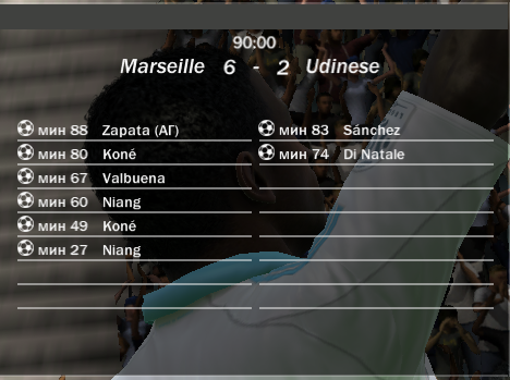 Статус: Offline | 20 тур Olympique Marseill (Devil792) 6-2 Udinese (Andreyyy) Голы: спс сопернику за игру не понимаю как он всех выигрывает игрок как игрок!четсно говоря мне было не очень то и тяжело играть! надеюсь кто-нить ещё сможет победить его!